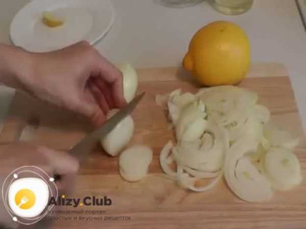 - Тонко нарезаем 4 луковицы и 1 лимон кольцами.