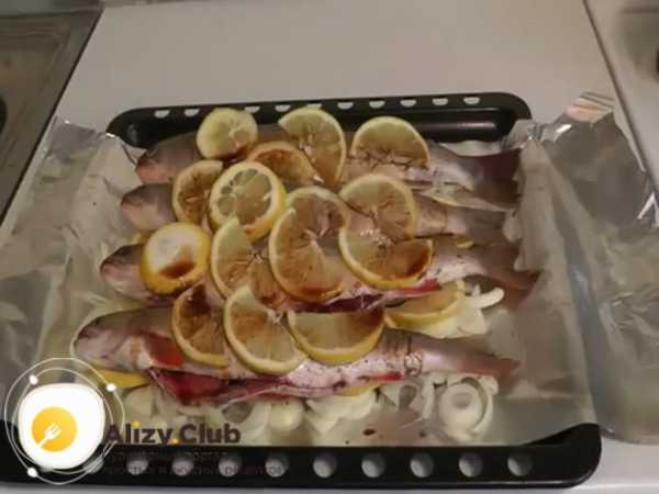 Холодный противень смазывается сливочным маслом, после чего на него выкладывается рыба. Когда рыба размещена на противне, сверху нее делаются небольшие надрезы ножом, в которые кладут дольки нарезанного лимона. Запекается рыба в духовой печи полчаса при температуре 180 градусов Цельсия. После приготовления можно подавать на стол. Ваша семья оценит великолепный вкус запеченного гольца.