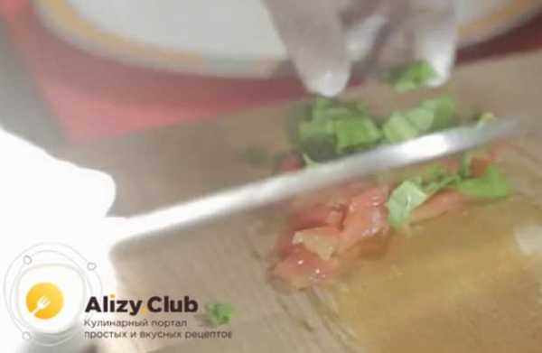 Теперь приготовим начинку. С помидоров следует снять кожицу, для этого делаем небольшие надрезы на помидоре и обдаем их крутым кипятком, после снимаем аккуратно кожицу. Томаты нужно нарезать мелким кубиком. Шпинат тоже режем мелко, а очищенные зубчики чеснока очень мелко рубим. Томаты, шпинат и чеснок перемешиваем и полученной смесью фаршируем гольца.
