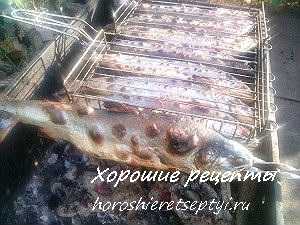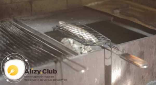 Затем перекладываем рыбу на специальную решетку и готовим на мангале по 10 минут с каждой стороны.