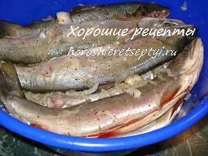 Лук режем полукольцами и слегка помнем руками, чтобы выделился сок. Затем лук отправляем к рыбе и заливаем полученным маринадом подготовленные тушки гольца, оставляем мариноваться в прохладном месте на 20 – 30 минут.