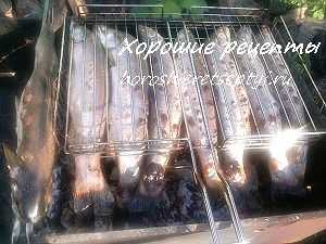 Кухонная утварь: угольный гриль; специальная металлическая решетка для барбекю; большая кухонная доска; кулинарная кисточка; острый средний нож для разделки рыбы; большой нож для шинковки овощей; плоское блюдо; удобное блюдо для сервировки; маленькие емкости для соли, специй и растительного масла.