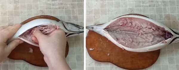 - Рыбу очистите, помойте и обсушите. Сделайте на тушке боковые надрезы. Натрите солью, сухими травами, в надрезы вставьте ломтики лука.