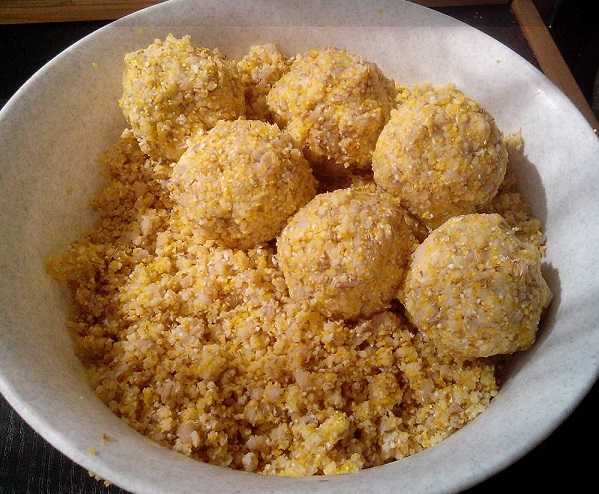 - Получившуюся кашу высыпают в емкость побольше, добавляют 2 стакана ячки, столько же кукурузной крупы и стакан манки.
