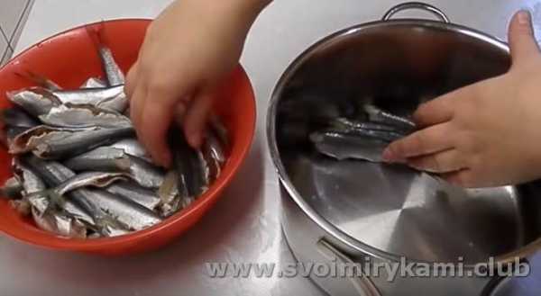 Затем промываем ее и складываем в кастрюлю или любую другую емкость. Я использовала стеклянный высокий противень. Рыбу надо укладывать спинками вверх, как выкладывают в консервной банке, тогда она не будет рассыпаться.