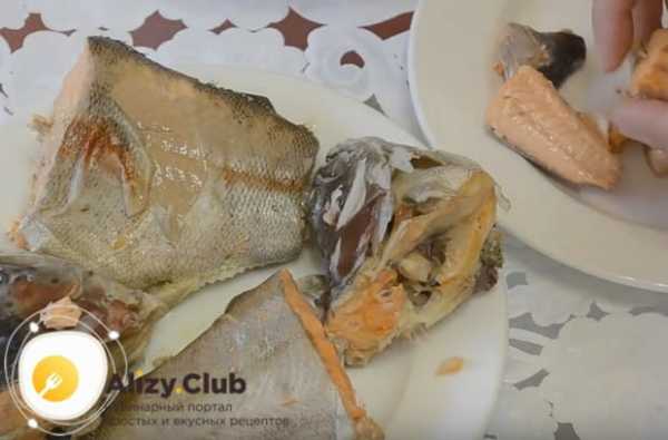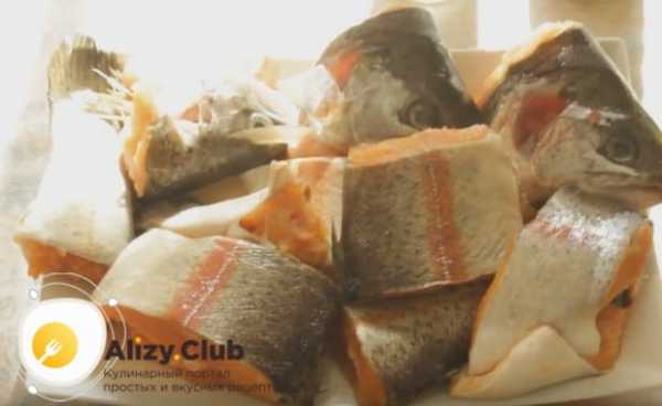 Рыбу разморозить и промыть, тщательно осмотреть и удалить всё несъедобное – остатки чешуи, внутренностей, глаза и жабры. Залить в кастрюле холодной водой вровень с рыбой и довести до кипения, после чего отвар слить. Со стенок кастрюли собрать пену, рыбу промыть и вновь залить 2,5 литрами кипятка.