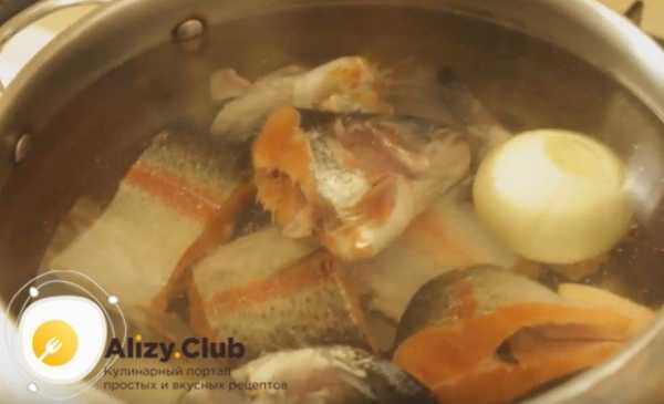 Промытую рыбу опускаем в трёхлитровую кастрюлю. Вливаем горячую воду, оставив немного места в расчёте на овощи. После закипания солим и кладём перец, можно добавить и тонкое колечко острого, но это на ваше усмотрение.