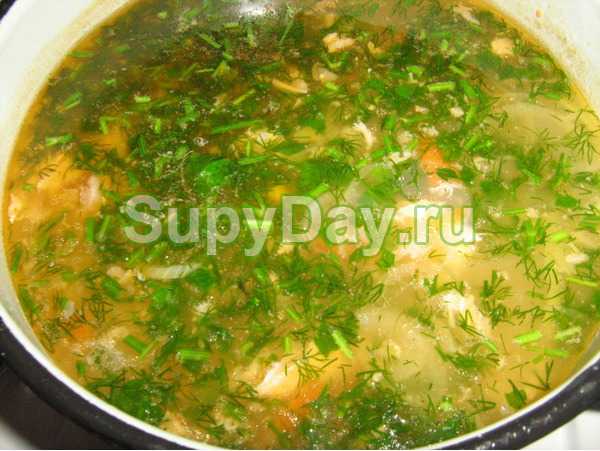 Варить пока картофель полностью сварится, добавить кусочки рыбы и варить еще около 3 минут. Разлить готовый суп в суповые тарелки и посыпать измельчённой зеленью укропа.