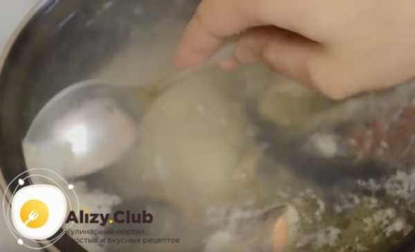 Снимаем пену, следя, чтобы не захватить при этом горошинки перца. После закипания нагрев уменьшаем, варим при умеренном волнении бульона тридцать минут, прикрыв неплотно крышкой.