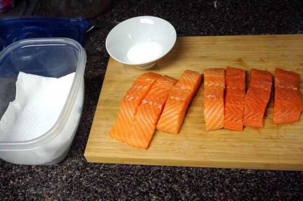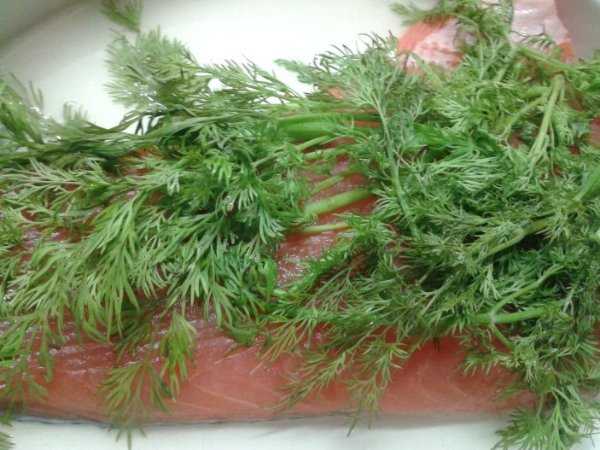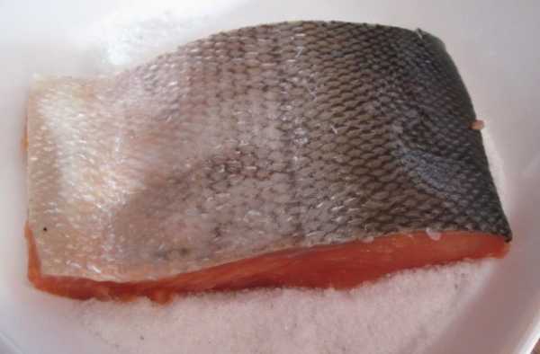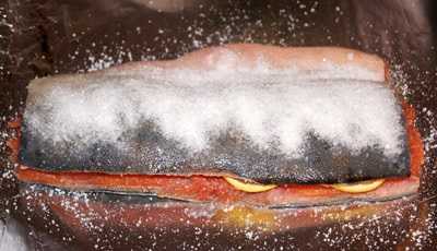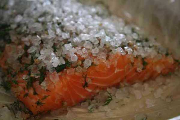 Идеальным вариантом может быть небольшой прямоугольный сотейник или глубокая жаровня. Необходимо, чтобы филе располагалось на дне достаточно свободно. Дно засыпаете крупной солью, на которую нужно выложить филе. Уже почти все готово, остается финальный штрих. Сверху засыпаете рыбу слоем соли и оставляете в комнате на 12 часов. Если вы любите малосольную рыбку, то можно вынуть ее уже через 6 часов. Эта зависит также от веса рыбы: чем он больше, тем дольше потребуется ждать.