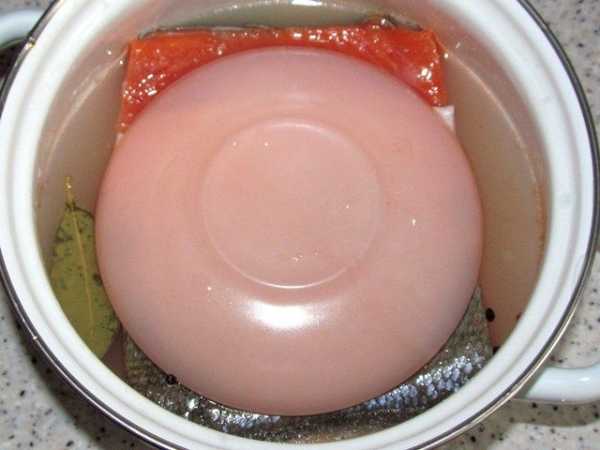 - Кладем рыбу в подходящую посуду и посыпаем сверху перцем и измельченным лавровым листом и ставим на рыбу тарелку.