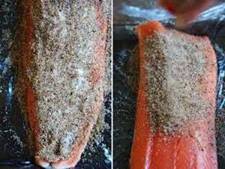 - На 1 килограмм очищенной красной рыбы берем 90 г полученной смеси и засыпаем ее, стараясь равномерно распределить, внутрь тушки.