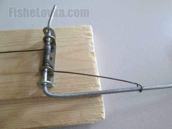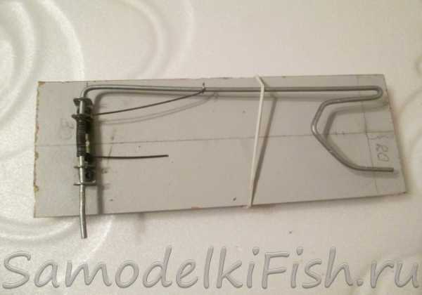 - Эта часть механизма будет осуществлять резкое натягивание лески, поэтому на этом этапе важно правильно рассчитать упругость пружины, добавляя витки постепенным образом, без уменьшения размеров пружины. Мощность пружины выбирается с учетом веса груза на конце снасти. Остается оставить отрезок длиной в половину рычага, а с другой стороны — 5−7-сантиметровый для предотвращения проворачиваний.