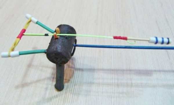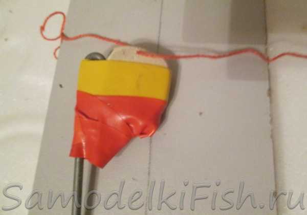 Чтобы резинка лучше держалась, ее необходимо дополнительно перемотать изолентой и прорезать маленькое отверстие, чтобы она могла пропустить через себя леску.