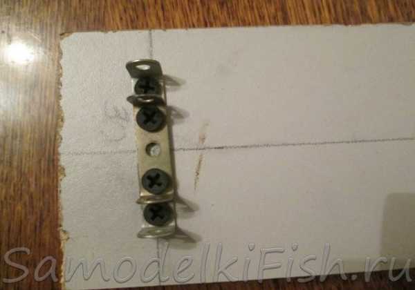 В трех сантиметров от одного из краев доски прикручиваем две скобы для установки рычага подсекателя и крепим их маленькими саморезами. Скобу для крепления можно изготовить из листового металла различной толщины, я воспользовался деталями детского конструктора.