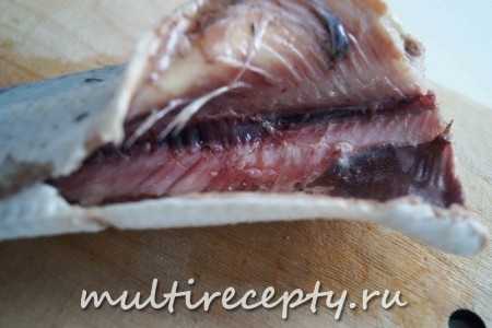 - Рыбу вымываем, отрезаем голову и вычищаем внутренности. Промываем и слегка обсушиваем бумажным полотенцем.