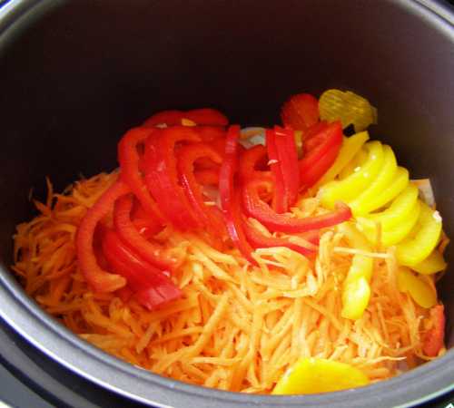 - Вначале выкладываем лук, сверху морковь, перец и помидоры.