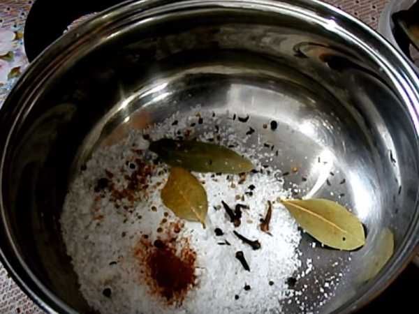 Сюда же кладем 5 шт. лаврового листа, щепотку душистого перца и столько же черного горошком.