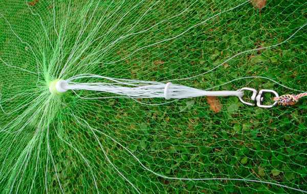 Если необходимо увеличить прочность «парашюта», по всему периметру окружности к сети привязывают стропы. Для этой цели можно использовать плетёный шнур немного меньшего диаметра, чем основная тяговая верёвка. Размер ячейки сети зависит от того, на какую рыбу будет вестись охота. Чем больший по размеру трофей планируется изловить в водоёме, тем больше должен быть этот параметр.