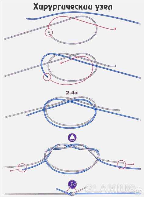 Как закрепить нить окончательно? Многие рукодельницы поступают так: в первом полуузле обвивают нитку дважды. Во втором полуузле нитку обвивают уже только раз. Другими словами, вы производите зеркальные действия относительно самого первого узла. Так получается хирургический узел. Почему хирургический? Да потому, что хирурги так соединяют нити во время операции.