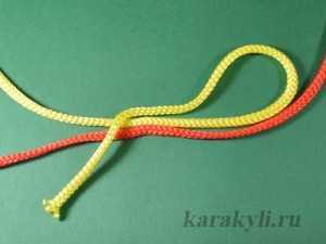 Красный шнур кладем ровно, из желтого шнура делаем петлю и располагаем рядом с красным шнуром.