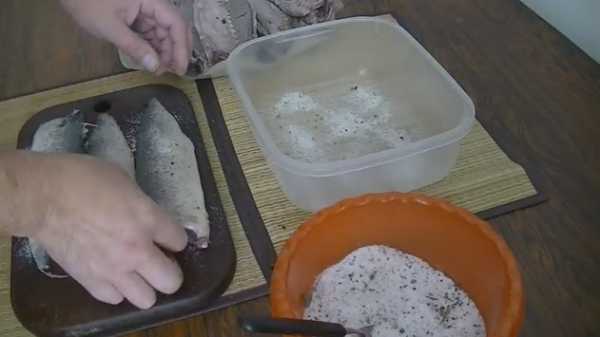- Натираем со всех сторон и внутри посолочной смесью и укладываем в посуду для засолки