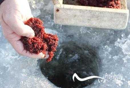 Готовую прикормочную смесь на морозе держу в пластиковом, закрытом ведерке, закутанном в теплые вещи. В первый раз при ловле на глубине 1,5-2,5 м и практически отсутствующем течении бросаю в каждую лунку по одной столовой ложке смеси, а потом через каждые 10-15 минут добавляю еще по щепотке прикормки.