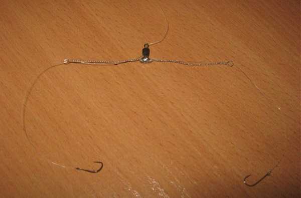 К проволочным петлям нужно привязать крючки на поводках длиной 4−5 см. Важно отметить, что после привязывания крючки не должны доставать друг до друга, в противном случае запутывания оснастки не избежать.