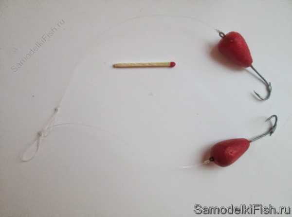 К основной леске привязывается пара поводков на расстоянии 70-80 см друг от друга. Длина поводков – 10-15 см. Используются крючки с длинным цевьем под номерами 6-9. На цевье надеваются небольшие пенопластовые цилиндрики, которые в дальнейшем повысят плавучесть приманки в воде. Такие цилиндрики чаще всего покрываются красной или зеленой краской.