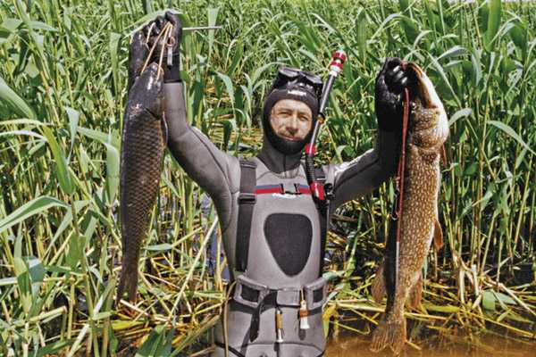 - Не стоит придавать большое значение цвету и раскраске костюма для подводной охоты. Камуфлированный верх имеет определенное значение при охоте в очень прозрачных водоемах – в морях и океанах. Пресноводная рыба, обитая в довольно мутной воде, больше ориентируется не на зрение, а на другие органы чувств (на ту же боковую линию). Поэтому, немного сэкономив на цене и взяв черный, а не камуфлированный костюм, в смысле успешности охоты вы ничего не потеряете. Виталий Виноградов, фото автора.