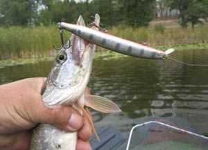 При этом не раз замечал, что щучка поднимается за этой приманкой и с глубины в 3-4 и более метров. Летит воблер не очень далеко и точно, поэтому его лучше применять для ловли в основном на ближней дистанции.