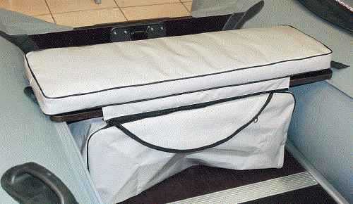 Они могут быть как самодельные из подручных средств, так и промышленного изготовления. Их можно использовать и как самостоятельные приспособления, и совместно с непромокаемой сумкой. В этом случае сумка на молниях пристегивается к накладке и устанавливается под банку. Объем таких сумок, в зависимости от модели лодки, определяется шириной кокпита и шириной используемой банки. Очень полезное приспособление для хранения мелких вещей, а также тех, которые влага может испортить.