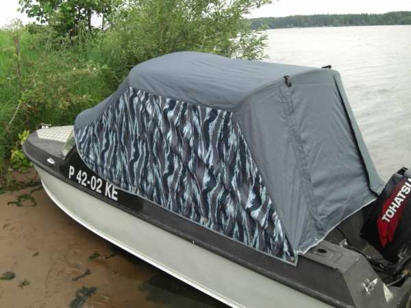 Кокпит моторной лодки можно закрыть тентом целиком. Он изготавливается из кордуры или авизента, реже из 350-550