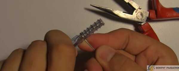 ΠΠ° ΡΠΏΠΈΡΡ Π½Π°ΠΌΠ°ΡΡΠ²Π°Π΅ΡΡΡ ΠΏΡΠΎΠ²ΠΎΠ»ΠΎΠΊΠ°. ΠΠΈΡΠΊΠΈ Π½Π°ΠΊΠ»Π°Π΄ΡΠ²Π°ΡΡΡΡ Π΄ΡΡΠ³ Π½Π° Π΄ΡΡΠ³Π°, ΡΡΠΎΠ±Ρ ΠΏΠΎΠ»ΡΡΠΈΠ»Π°ΡΡ ΡΡΡΠ±ΠΎΡΠΊΠ° Π΄Π»ΠΈΠ½ΠΎΠΉ 5 ΡΠΌ. ΠΠΎΡΠ»Π΅ ΡΡΠΎΠ³ΠΎ ΡΠΏΠΈΡΠ° Π²ΡΠ½ΠΈΠΌΠ°Π΅ΡΡΡ. ΠΠΎΠ»ΡΡΠ΅Π½Π½Π°Ρ ΡΡΡΠ±ΠΊΠ° Π²ΡΡΠ°Π²Π»ΡΠ΅ΡΡΡ Π²Π½ΡΡΡΡ ΡΠ°ΡΠΈΠΊΠΎΠ²ΠΎΠΉ ΡΡΡΠΊΠΈ. ΠΠ»ΠΈΠ½Π½ΡΠΉ ΠΊΠΎΠ½Π΅Ρ ΠΏΡΠΎΠ²ΠΎΠ»ΠΎΠΊΠΈ Π²Ρ ΠΎΠ΄ΠΈΡ Π² ΠΏΡΠΎΠΏΠΈΠ»Π΅Π½Π½ΠΎΠ΅ Π³Π½Π΅Π·Π΄ΠΎ, ΠΈ Π½Π°ΡΠΈΠ½Π°ΡΡΡΡ Π²ΠΈΡΠΊΠΈ ΡΠΆΠ΅ ΠΏΠΎ ΠΏΠΎΠ²Π΅ΡΡ Π½ΠΎΡΡΠΈ ΡΡΡΠΊΡ. ΠΠ΅Π»Π°ΡΡΡΡ ΠΎΠ½ΠΈ Ρ Π½Π΅ΠΊΠΎΡΠΎΡΡΠΌ ΡΠ°Π³ΠΎΠΌ, ΡΡΠΎΠ±Ρ Π² Π½ΠΈΡ ΠΌΠΎΠΆΠ½ΠΎ Π±ΡΠ»ΠΎ ΠΏΡΠΎΠΏΠΈΡ Π½ΡΡΡ ΠΏΡΠΈΠΊΠΎΡΠΌΠΊΡ. ΠΠ°ΠΊ ΡΠΎΠ»ΡΠΊΠΎ ΠΎΠ½ΠΈ Π΄ΠΎΡΠ»ΠΈ ΠΊ ΠΊΡΠ°Ρ Π²Π½ΡΡΡΠ΅Π½Π½Π΅ΠΉ ΡΡΡΠ±ΠΊΠΈ Π½Π°ΠΌΠΎΡΠΊΠ° ΠΏΡΠ΅ΠΊΡΠ°ΡΠ°Π΅ΡΡΡ. Π ΡΡΠΊΠ° Π²ΡΡΡΠ³ΠΈΠ²Π°Π΅ΡΡΡ ΠΈ ΠΏΠΎΠ»ΡΡΠ°Π΅ΡΡΡ Π³ΠΎΡΠΎΠ²Π°Ρ ΠΏΡΡΠΆΠΈΠ½ΠΊΠ°. ΠΠ±Π° Π΅Π΅ ΠΊΠΎΠ½ΡΠ° ΠΏΠ΅ΡΠ΅ΠΊΡΡΡΠ²Π°ΡΡΡΡ.