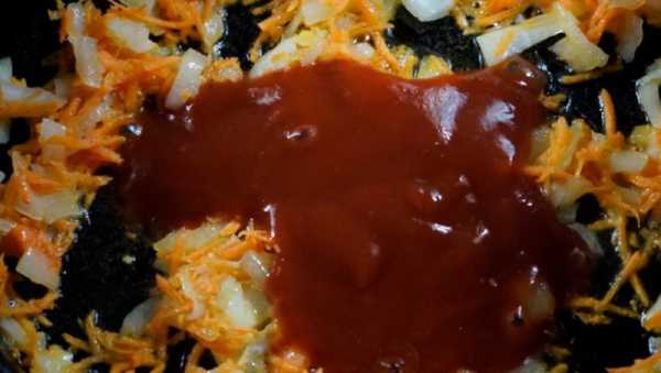 - После чего закладываем в кастрюлю консервированную горбушу и овощи. Морковь и лук по желанию обжариваем.