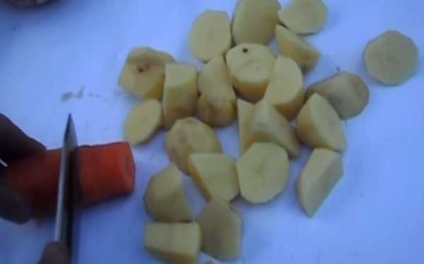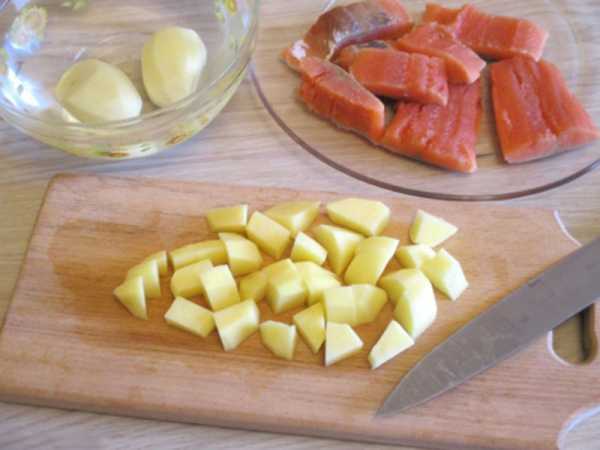 Внимание! В дальнейшем в уху будет добавляться целая, нечищеная луковица. Этот маневр лучше делать на этапе приготовления первого бульона на головах и хвосте. Но никак не на завершающем этапе. - Нарезаем картофель и морковь.