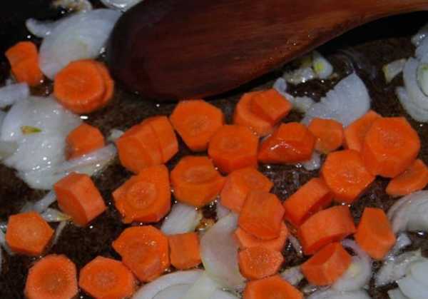 Порезать полукольцами репчатый лук, обжарить его в сковороде, но не поджаривать, а протушить, чтобы он стал мягким. Добавить тонкие ломтики свежей морковки и перца, прогреть и добавить в бульон. Варить до мягкости всех овощей.