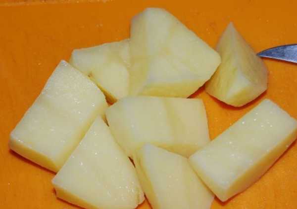 - Нарезаем картофель. Отправляем в суп сначала картофель, потом овощную зажарку и варим 15 минут до полной готовности картофеля.