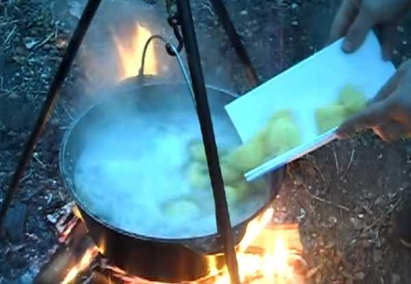 - В кипящую уху добавляем горящее полено, вливаем рюмку водки. Снимаем казан с огня.