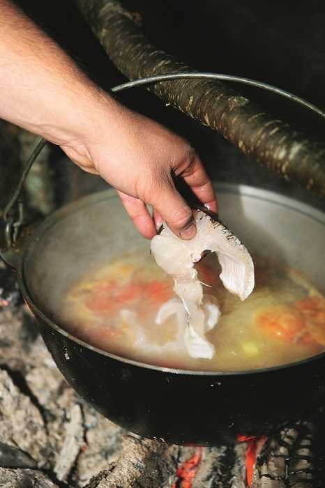 Попутно бросаем горошины перца, солим, кипятим еще пару минут. В конце приготовления опускаем на мгновение тлеющую головешку из костра, вливаем водку. Убираем казан с огня, накрываем крышкой, настаиваем 10 минут.