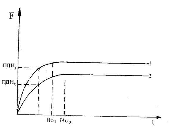 Рис. 46. Зависимость ПДН на страховочный ремень от предела H0: 1 – веревка с меньшим пределом H0; 2 – веревка с большим пределом H0