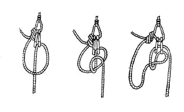 Самозатягивающиеся узлы. Применяются обычно в аварийной ситуации, когда какой–либо из самохватов сломался, потерся или не закусывает грязную веревку. Их прочность близка к объявленной прочности веревки, из которой они сделаны, потому что, как известно, здесь работает двойная веревка (см. п.6.1). Это позволяет с достаточной безопасностью использовать шнуры диаметром 5 и 6 мм.