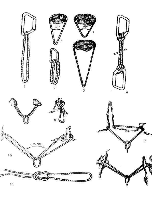 Несмотря на наличие узла, практическая прочность веревки, связан- ной в петлю, почти не меняется и остается близкой по значению к прочности, объявленной производителем. Например, вспомогательная веревка толщиной 7 мм, имеющая объявленную прочность 1170 кгс, связанная в петлю, рвется при 1150 кгс. Если петля сдвоена (рис. 43-4), практическая прочность возрастает до 2850 кгс, потому что в петле веревка работает соответственно вдвое и вчетверо. Это, однако, верно только при условии, что плечи петли параллельны одно другому (рис. 43-1). Чем больше угол между ними, тем меньше прочность петли. При угле 30 градусов натяжение в каждом плече увеличивается на 3%, а при 60 градусах — уже на 15% (рис. 43-2,3). Поэтому при использовании петель надо соблюдать то же условие, что и при устройстве V-образного крепления, т.е. не допускать угла между плечами петли свыше 90 градусов. Это легко достигается использованием петель различной длины. Если естественная опора, на которую навешивается петля, более массивна, угол между плечами петли уменьшится, если увеличить длину плеч (рис. 43-5). Кроме того, более длинная петля всегда имеет лучшие амортизационные свойства, что немаловажно для надежности крепления.