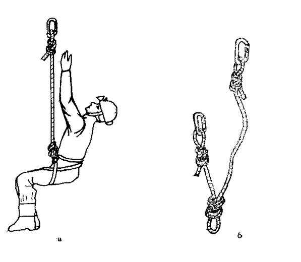Страховочный конец можно сделать и двойным. Для этой цели используют более длинную веревку около 2.7 м при диаметре 11 мм. После того, как на двух ее концах будут завязаны необходимые узлы, веревка сдваивается узлом «восьмерка» (или «девятка» для диаметра 9 мм), в результате чего получается третий узел (рис. 45б). При этом один конец должен иметь длину 50 см, а другой – не более 75 см, включая карабины. Страховочный конец встегивают в треугольный карабин MR нижней обвязки петлей сдвоенного конца.