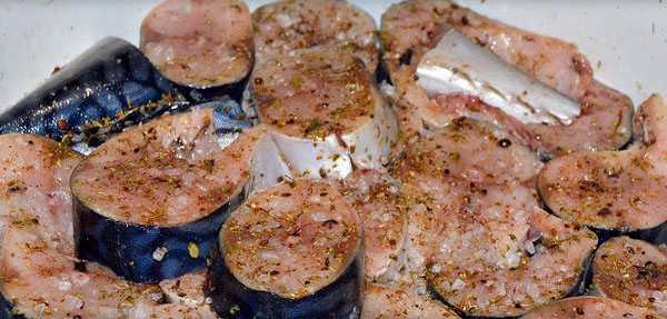 Рыбные кусочки необходимо натереть сухим составом, сложить в стеклянную или пластиковую тару и поставить в холодильник. Спустя сутки получится среднесоленая скумбрия, а через двое суток рыба станет более соленой и пряной.