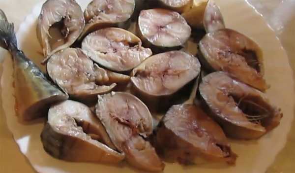 Луковая шелуха придает скумбрии золотистый цвет и приятный вкус.Рыбу нарезаем порционными кусочками и подаем к столу.