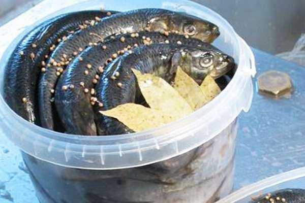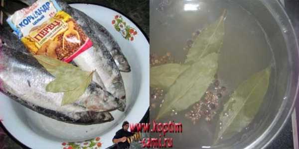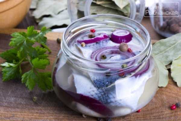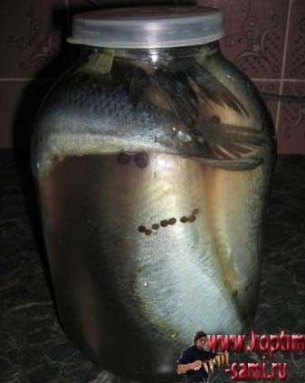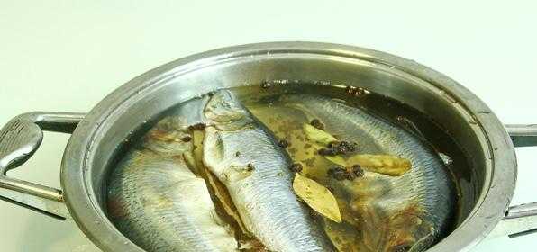 Все ингредиенты залить водой и кипятить 2 минуты. Потом добавить 20 мл 9% уксуса. Рыбины укладываются в литровую банку и полностью заливается остывшим соляным раствором. Банка убирается в холодильник на 24 часа.