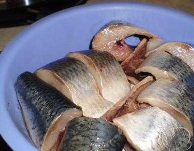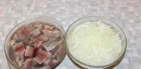 Рецепт достаточно прост и не требует много ингредиентов. Мороженую селедку разморозить, но не до конца. Тушку избавить от потрохов, отделить от кожицы и костей. Нарезать филе на средние кусочки и выложить в приготовленную посуду.