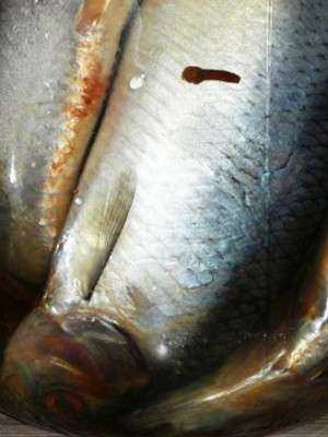 - Вмятины на теле рыбы — признак того, что рыбу как заморозили в море, так и не размораживали более. Вмятины образовываются от того, что только что выловленные рыбины давят друг на друга.