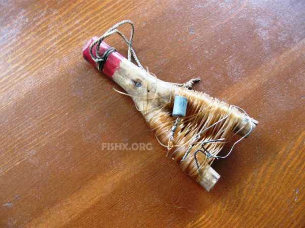 Самая простая жерлица, которая использовалась ещё в давние времена, представляет собой рогатку, срезанную из ивняка, но обязательно высушенную, чтобы её не сдавило высыхающей леской. На рогатку-рогульку наматывают в виде восьмёрки около 10 метров лески диаметром 0,5 мм. Далее на конце лески крепят грузило и застёжку с вертлюжком. К застёжке пристёгивают металлический поводок. Поводок лучше делать из довольно жёсткого сталистого материала. Это позволит быстро и без затруднений пропускать поводок в рот и сквозь жабры живца. Такой способ, когда пропущенный сквозь жабры поводок пристёгивается затем к застёжке, можно назвать самым надёжным. Хищник обычно никогда не сходит с такой жерлицы. Но при этом рыбка живёт гораздо меньше, чем при способе, когда её зацепляют за спинной плавник или губы. Но во втором случае срывов живца и сходов хищника с крючка бывает гораздо больше. Компромиссным вариантом может послужить способ насадки живца, когда рыбку одновременно цепляют под спинной плавник и за губу. Но для этого на поводке надо закреплять два крючка: на конце поводка – одинарный крючок и чуть выше – двойник.